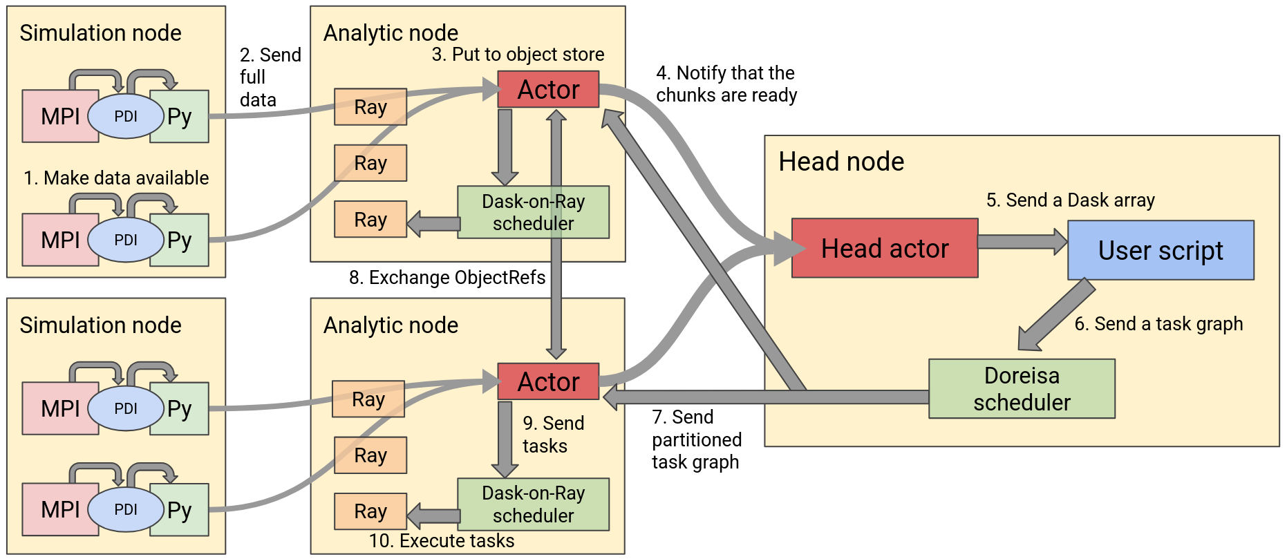 This Master's project introduces Doreisa (Dask-on-Ray Enabled In Situ Analytics), a scalable and efficient system for in situ analysis of simulation data. Doreisa offers a Dask-based interface, allowing a simple definition of analysis tasks. Experiments show that Doreisa scales well to hundreds of nodes, allowing it to run on the Jean Zay supercomputer.